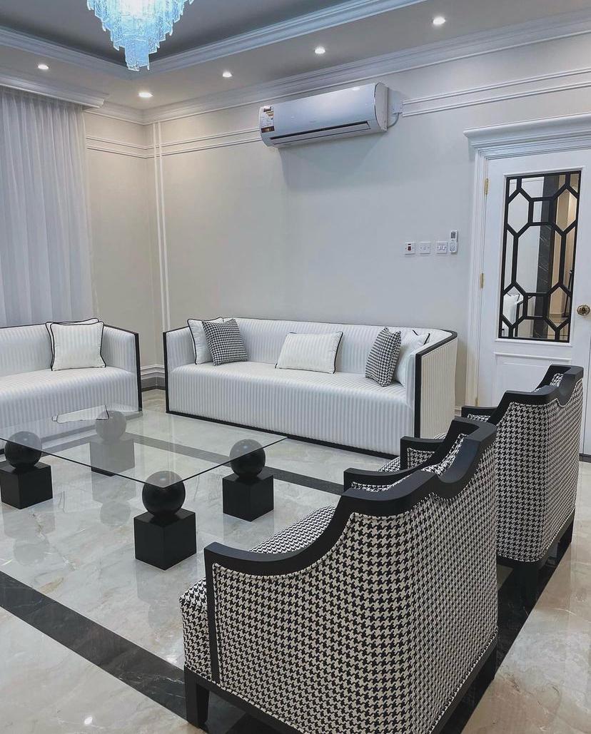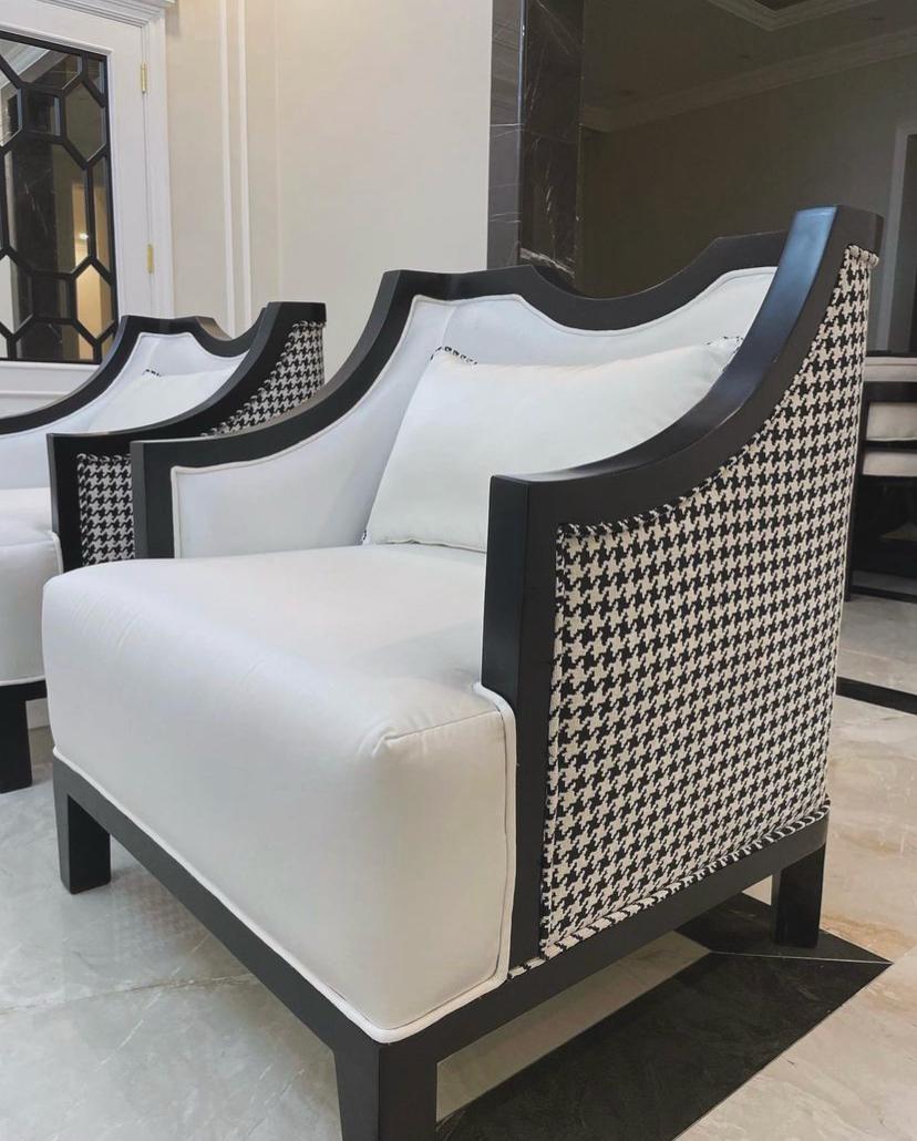 طقم كنب وكراسي مفردة بتصميم معاصر يعتمد على التباين اللوني والخطوط الواضحة. مثالي للمكاتب والمجالس الرسمية التي تتطلب مظهراً منظماً وأنيقاً.