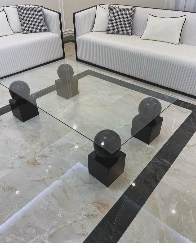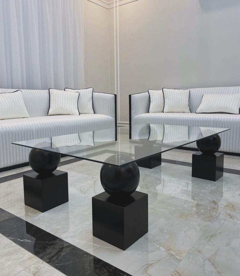 الطاولة: تتوفر طاولة وسط زجاجية بقواعد هندسية سوداء متوافقة مع تصميم الطقم.