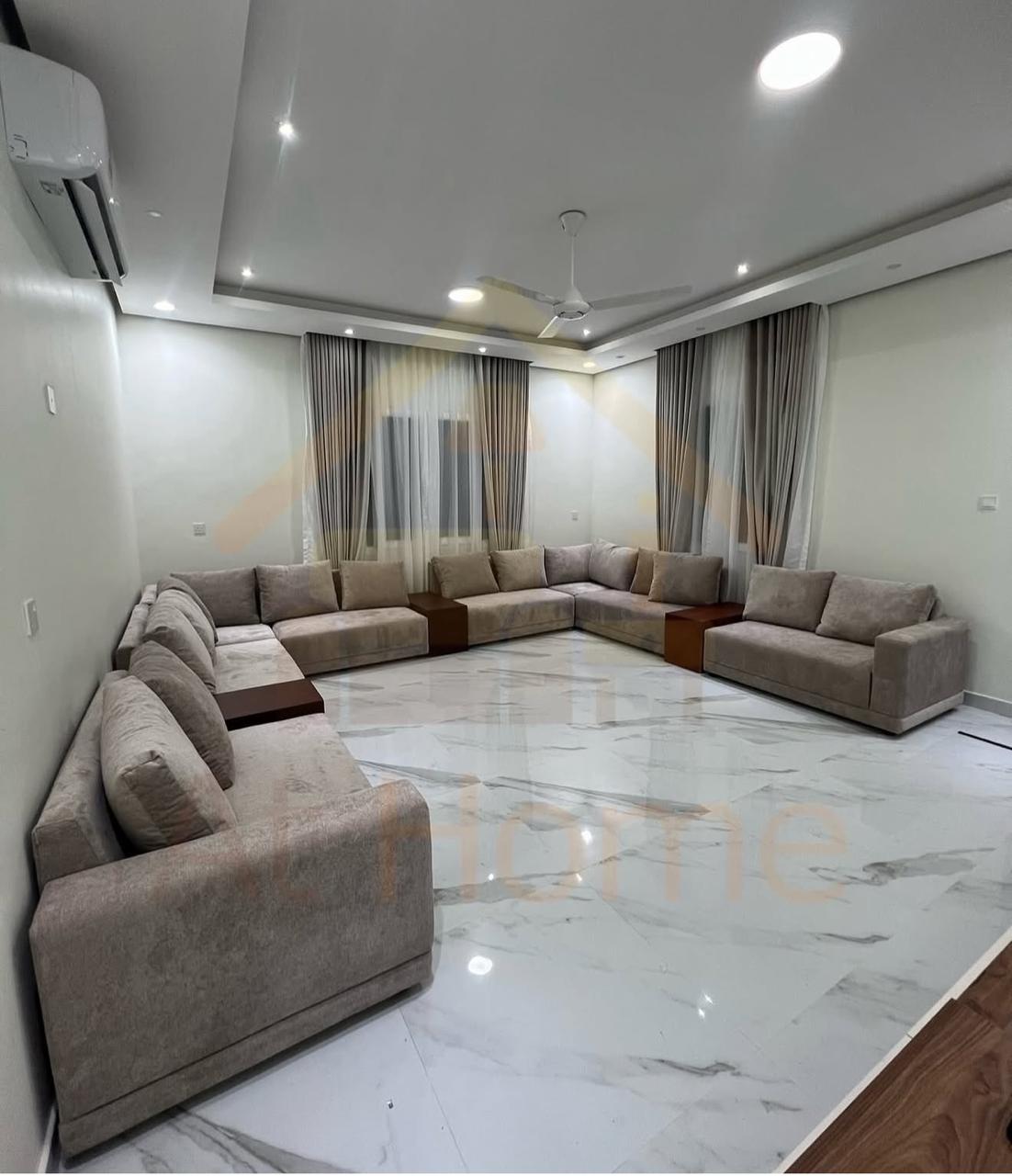 ظام جلوس مودرن متصل مصمم خصيصاً للمجالس العائلية وصالات الاستقبال الكبيرة. يتميز هذا الموديل بدمج طاولات جانبية خشبية داخل التصميم لتوفير طابع عملي وأنيق في آن واحد.