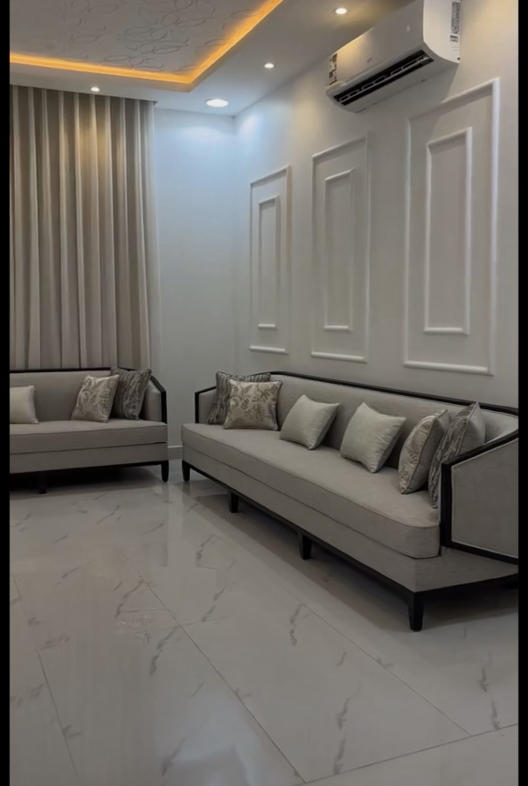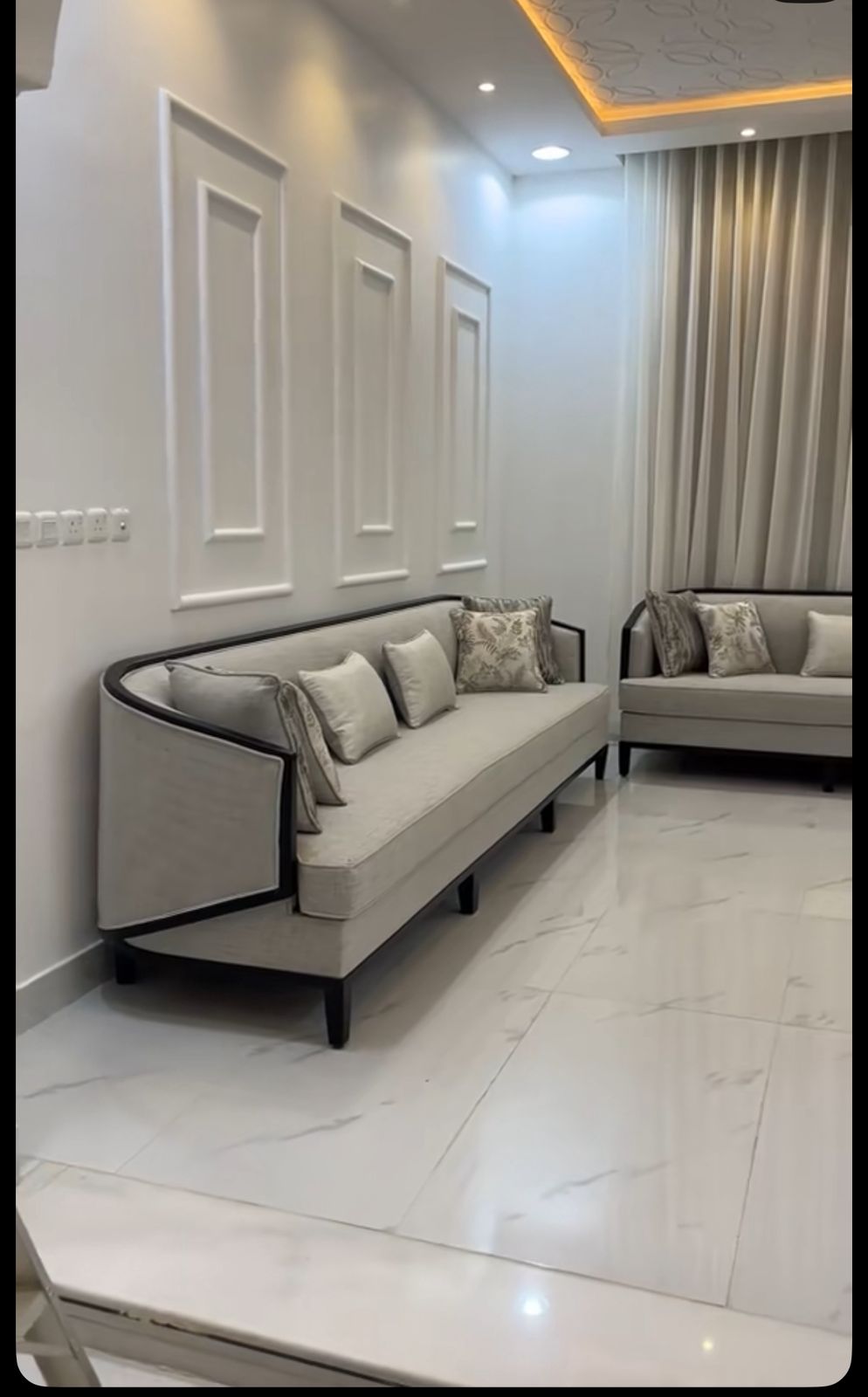 اضف لمسة من الرقي العصري لغرفة استقبالك مع هذا الطقم الفريد من نوعه. صُمم هذا المجلس ليجمع بين فخامة النيو كلاسيك وبساطة الخطوط المودرن، حيث يبرز الإطار الخشبي الداكن تفاصيل الانحناءات الجانبية، مما يجعله قطعة فنية متكاملة في منزلك.