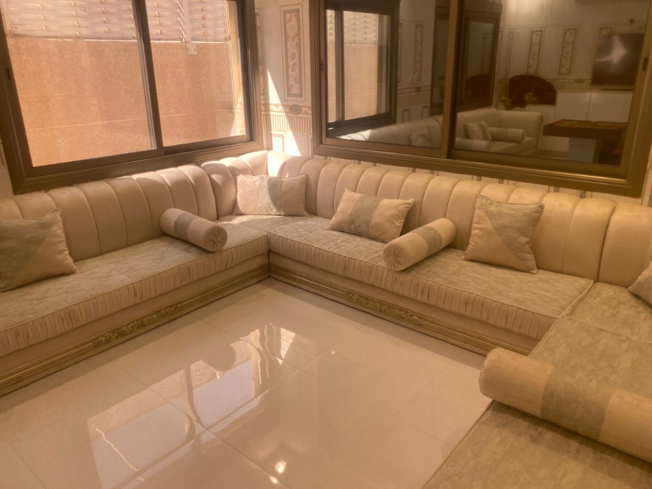 التصميم: جلسة أرضية مريحة مع وسائد ظهر مرتفعة ووسائد جانبية (مراكي) دائرية ومستطيلة لإتمام المظهر المغربي.