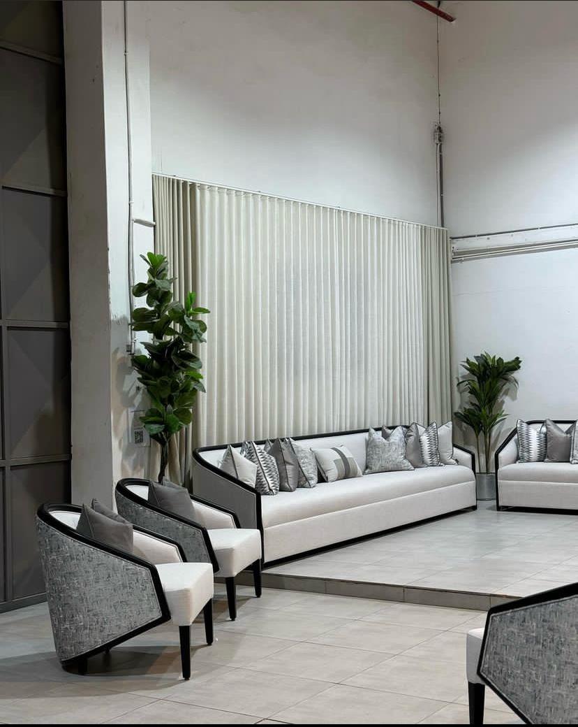 طقم مجلس يجمع بين التوازن الهندسي وفخامة النمط النيو كلاسيك (Neo-Classic). يتميز التصميم بخطوط واضحة وإطارات تبرز تفاصيل القطع، مما يجعله مناسباً للمساحات الرسمية العصرية.