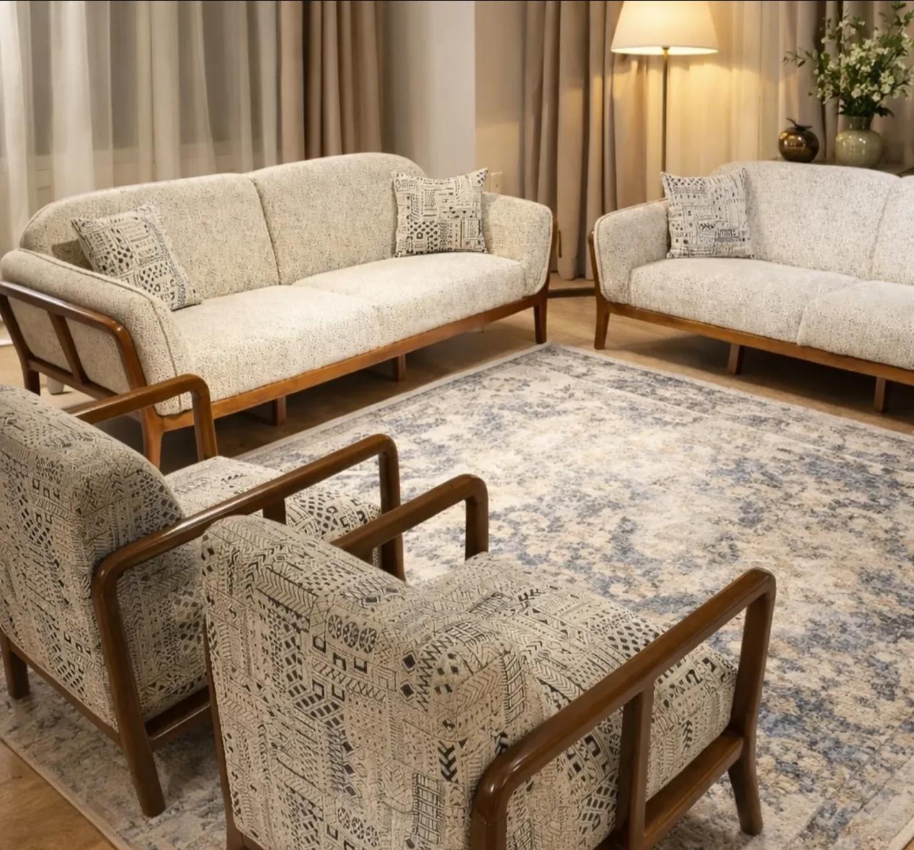 طقم مجلس متكامل يجسد فخامة التصميم النيو كلاسيك، مصمم ليعطي طابعاً ملكياً للمساحات الواسعة. يتميز بتفاصيل الحياكة اليدوية الدقيقة التي تبرز جودة التنفيذ.